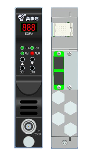 GSDT-EDFA系列1550nm光纤放大模块是设计与高性能光纤传输网络,可同时传输模拟信号和数字信号GSDT-EDFA系列产品利用单个或者双个高性能的980nm泵浦激光器,通过独特的设计技术,以较低的噪声系数,提供从14dBm到23dBm的输出光功率。产品具有高级的MCU控制电路来检控模块的全部参数和报警状态。所有参数都可以通过前面板的LED显示灯或者用控制软件从本地或者远程来控制模块。